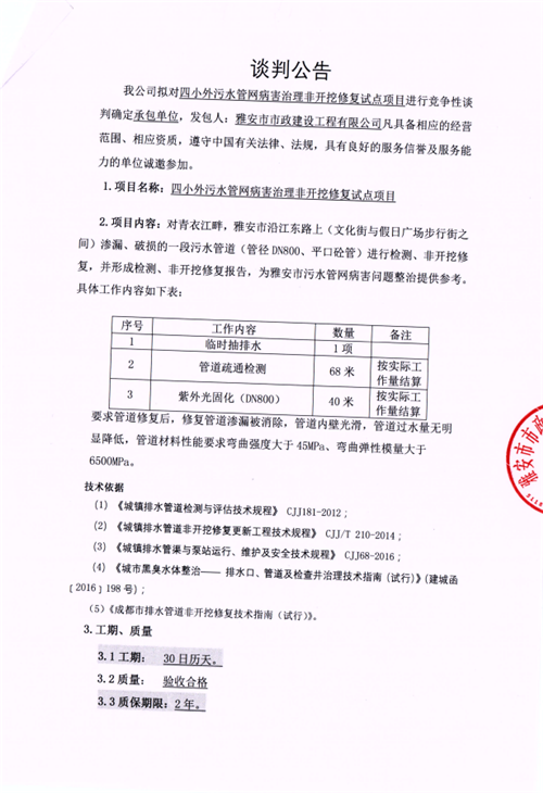 四小外污水管網(wǎng)病害治理非開挖修復試點項目競爭性談判公告(市政公司)