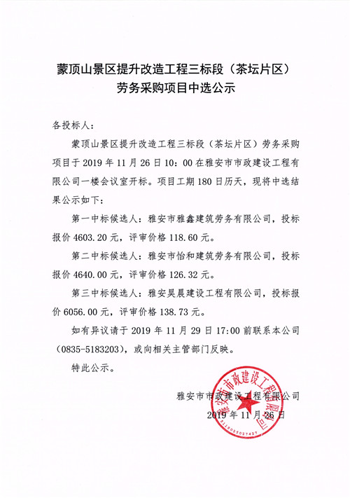 蒙頂山景區(qū)提升改造工程三標(biāo)段(茶壇片區(qū))勞務(wù)采購項(xiàng)目招標(biāo)中選公示