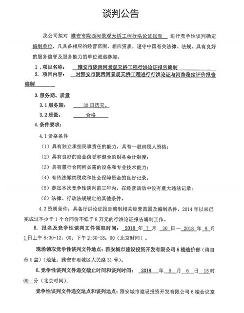 雅安市隴西河景觀天橋工程行洪論證報(bào)告競(jìng)爭(zhēng)性談判公告