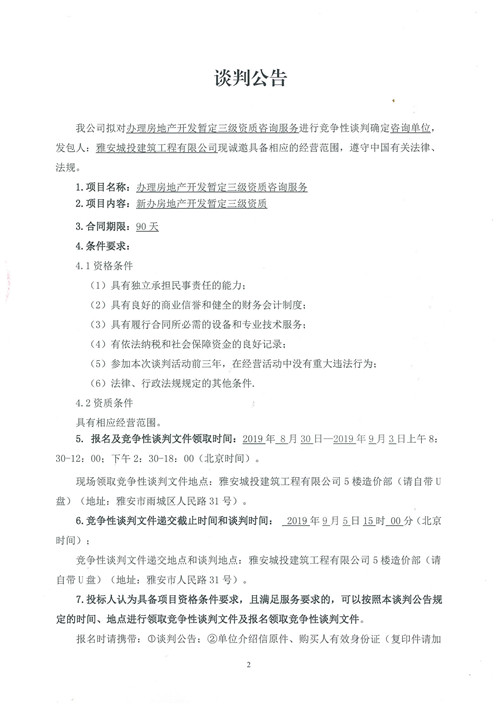 雅安城投建筑工程有限公司辦理房地產(chǎn)開發(fā)暫定三級資質(zhì)咨詢服務競爭性談判公告