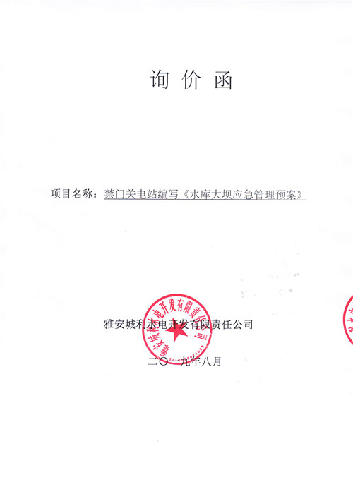 雅安城利水電開發(fā)有限責(zé)任公司禁門關(guān)電站編寫《水庫大壩應(yīng)急管理預(yù)案》競(jìng)爭(zhēng)性談判公告