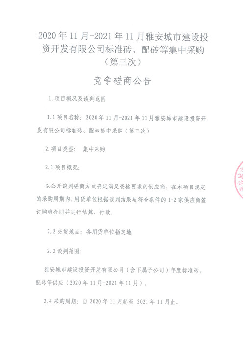 2020年11月-2021年11月雅安城市建設投資開發(fā)有限公司標準磚、配磚等集中采購(第三次)競爭磋商公告