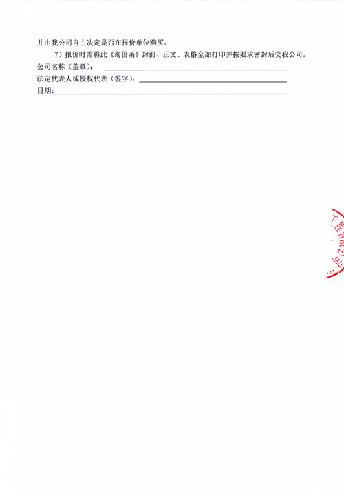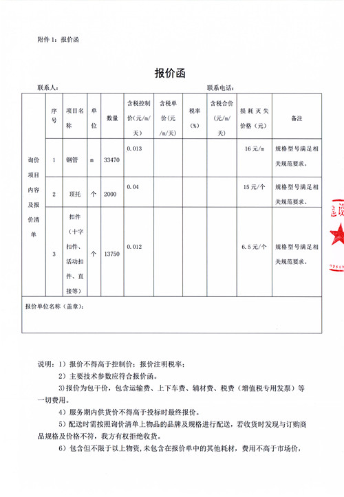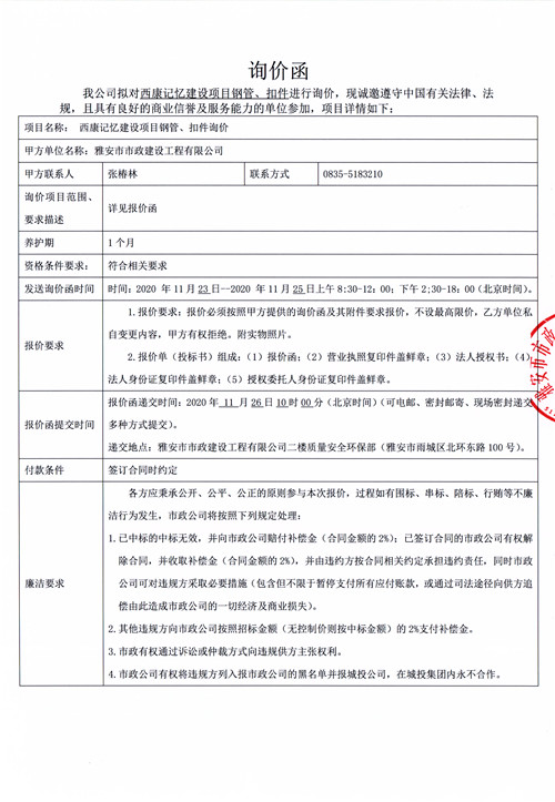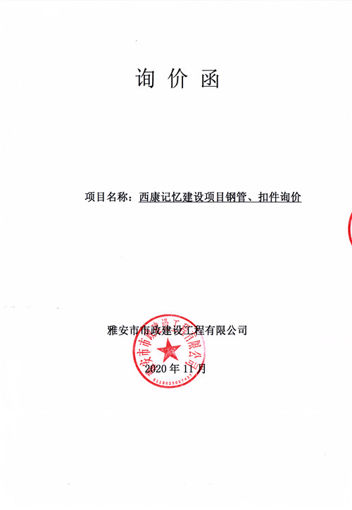 市政公司西康記憶建設項目鋼管、扣件詢價函