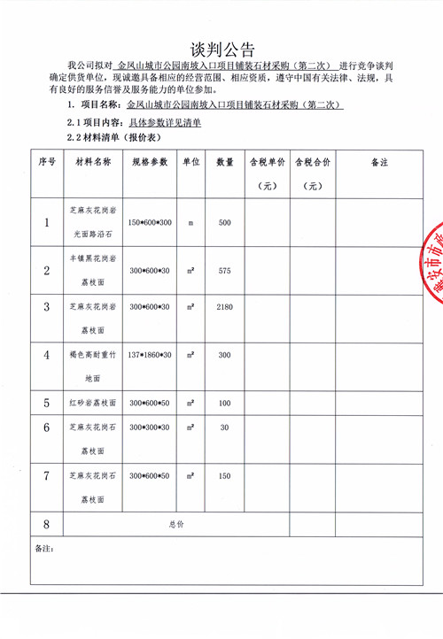 金鳳山城市公園南坡入口項(xiàng)目鋪裝石材采購(gòu)(第二次)競(jìng)爭(zhēng)性談判公告