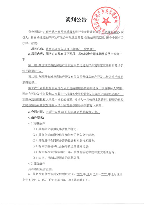 城投地產(chǎn)公司辦理房地產(chǎn)開發(fā)資質(zhì)服務(wù)確認(rèn)中介服務(wù)單位的競(jìng)爭(zhēng)性談判公告