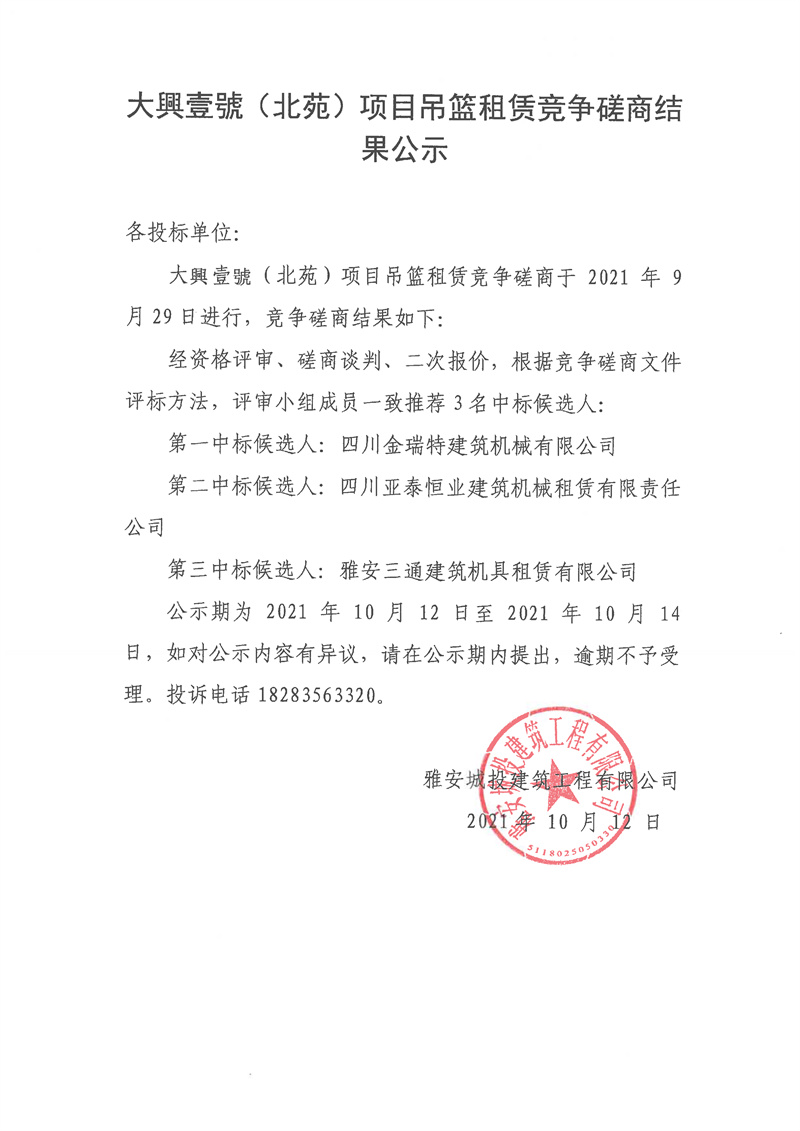 大興壹號(北苑)項(xiàng)目吊籃租賃競爭性磋商(第二次)結(jié)果公告