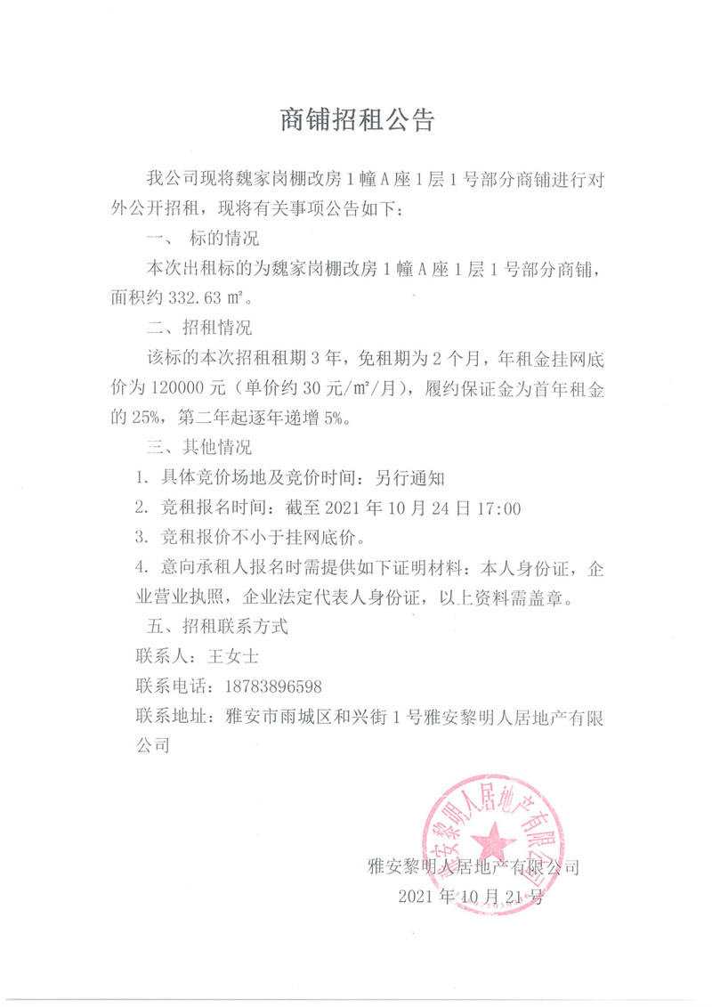 魏家崗安置房1幢A座1層1號部分商鋪招租公告