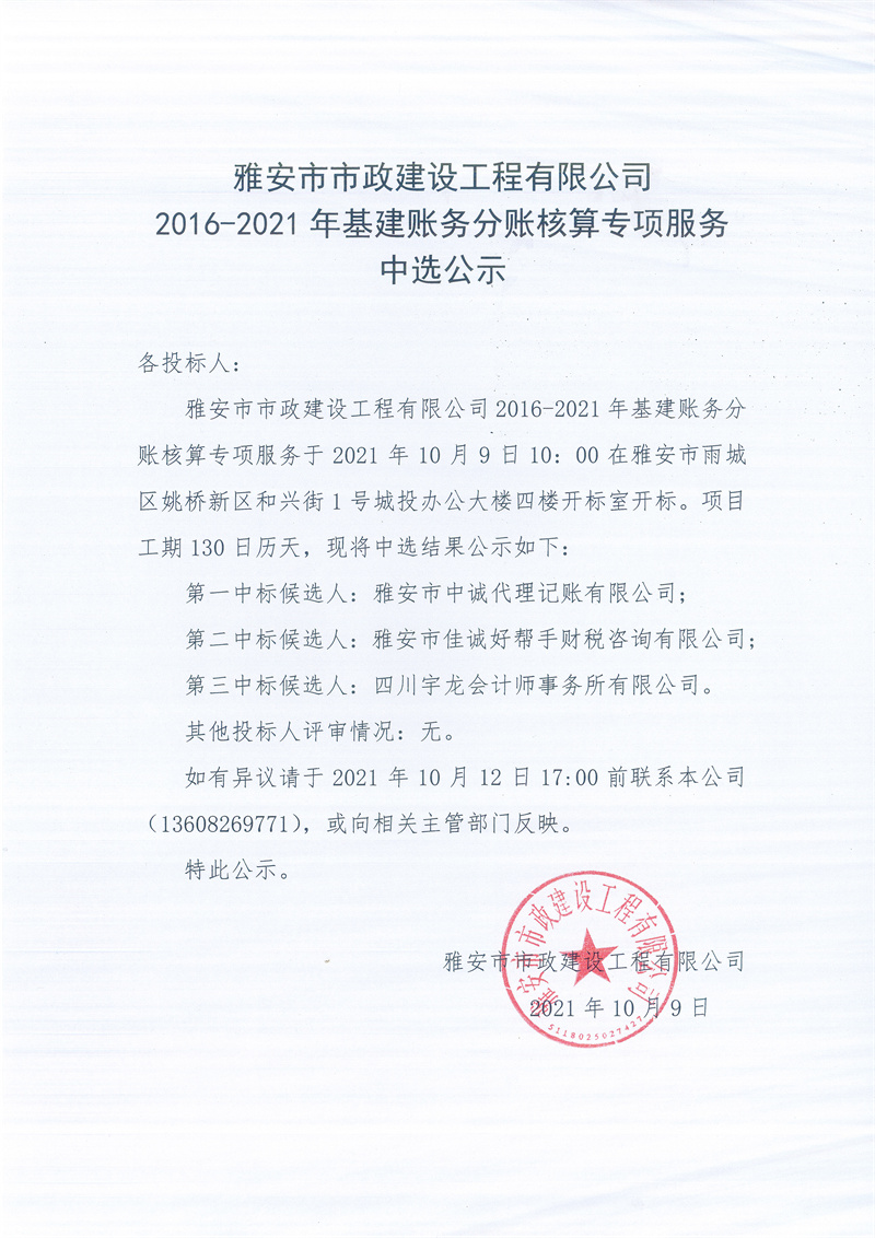 雅安市市政建設(shè)工程有限公司2016-2021年基建賬務(wù)分賬核算專(zhuān)項(xiàng)服務(wù)中選公示