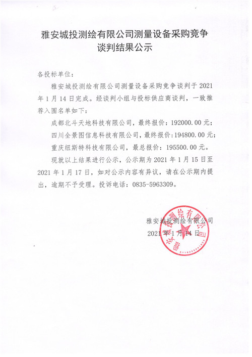 雅安城投測繪有限公司測量設(shè)備采購競爭談判結(jié)果公示