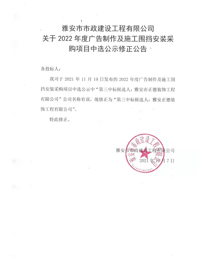 雅安市市政建設(shè)工程有限公司2022年度廣告制作及施工圍擋安裝采購(gòu)項(xiàng)目中選公示修正公告