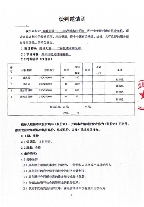 市政公司雨城大道一、二標(biāo)段透水磚采購(gòu)競(jìng)爭(zhēng)性談判公告