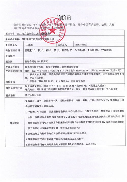 黎明咨詢公司2021年廣告制作、文印資料服務(wù)詢價函