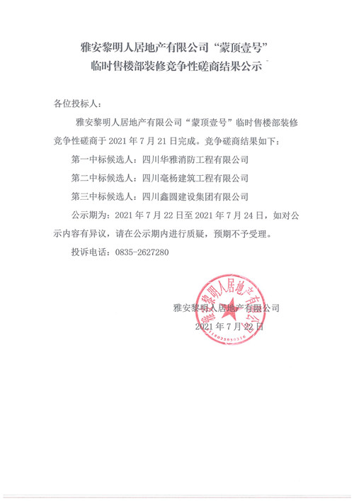 黎明人居公司黎明·蒙頂壹號臨時售樓部裝飾裝修競爭性磋商結果公示