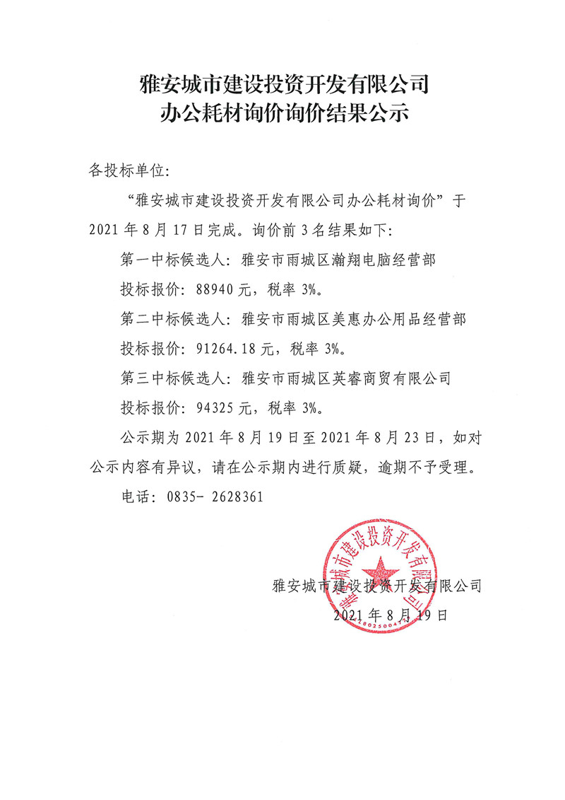 城投公司辦公耗材詢價(jià)結(jié)果公示