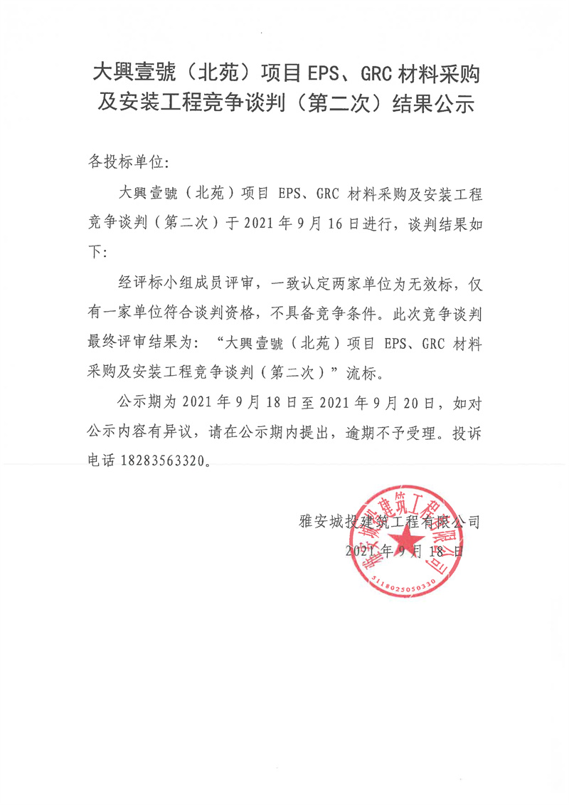 大興壹號(hào)(北苑)項(xiàng)目EPS、GRC材料采購(gòu)及安裝工程競(jìng)爭(zhēng)談判(第二次)結(jié)果公示