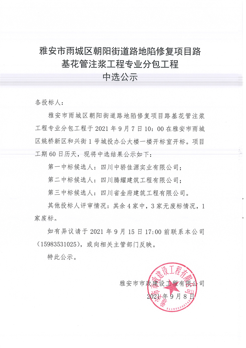 雅安市雨城區(qū)朝陽(yáng)街道路地陷修復(fù)項(xiàng)目路基花管注漿工程專(zhuān)業(yè)分包工程中選公示