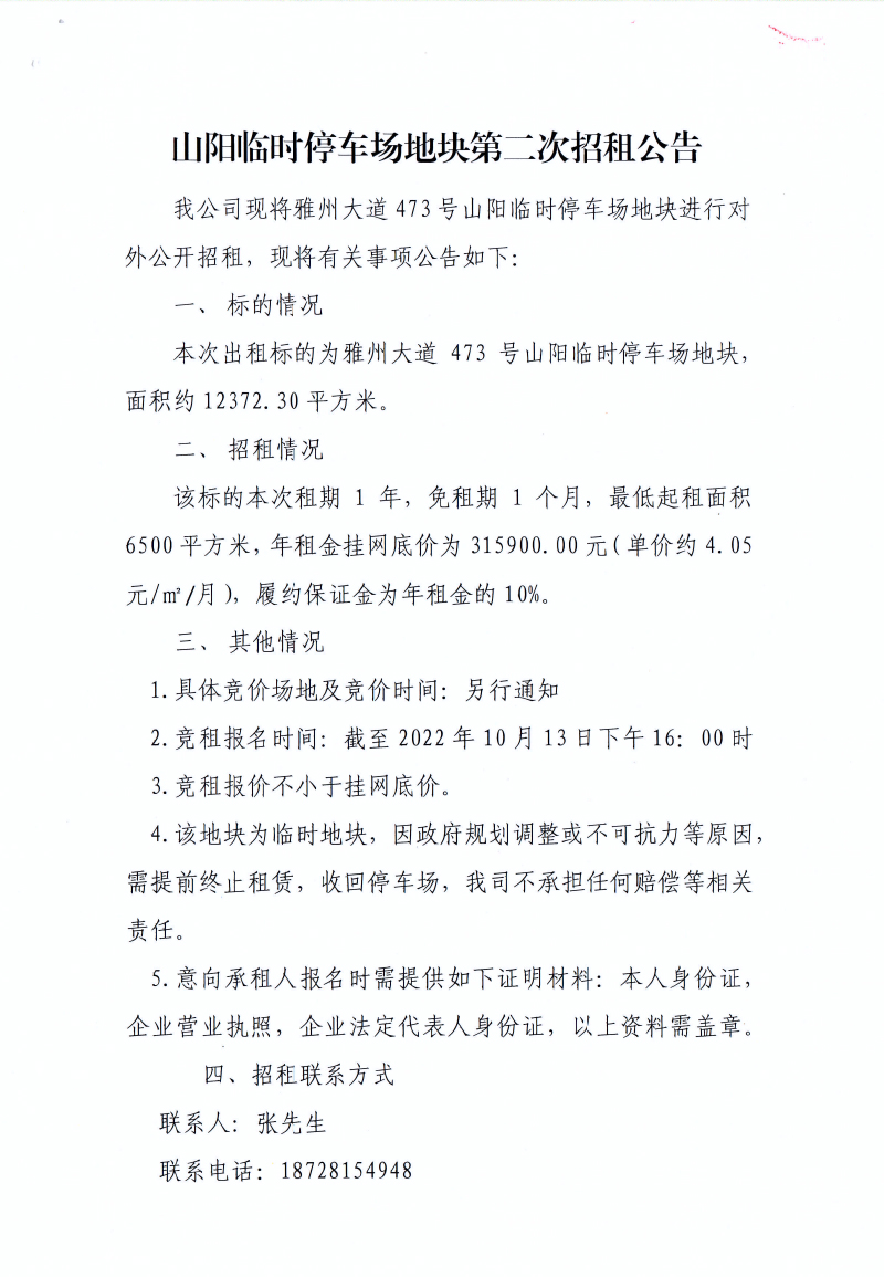 山陽臨時停車場地塊第二次招租公告