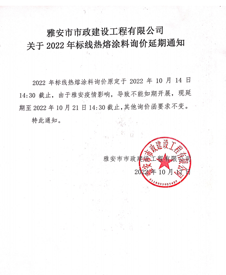雅安市市政建設(shè)工程有限公司關(guān)于2022年標(biāo)線熱熔涂料詢價(jià)延期通知