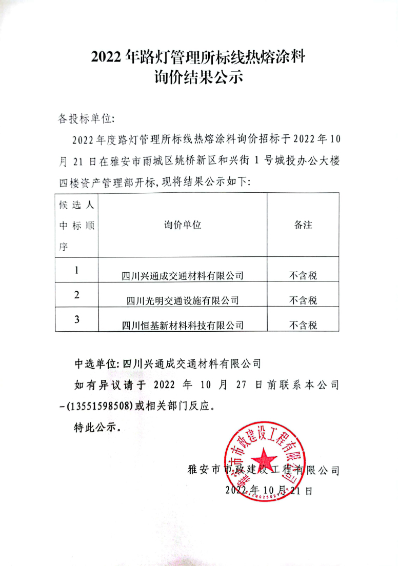 2022年路燈管理所標(biāo)線熱熔涂料詢價結(jié)果公示