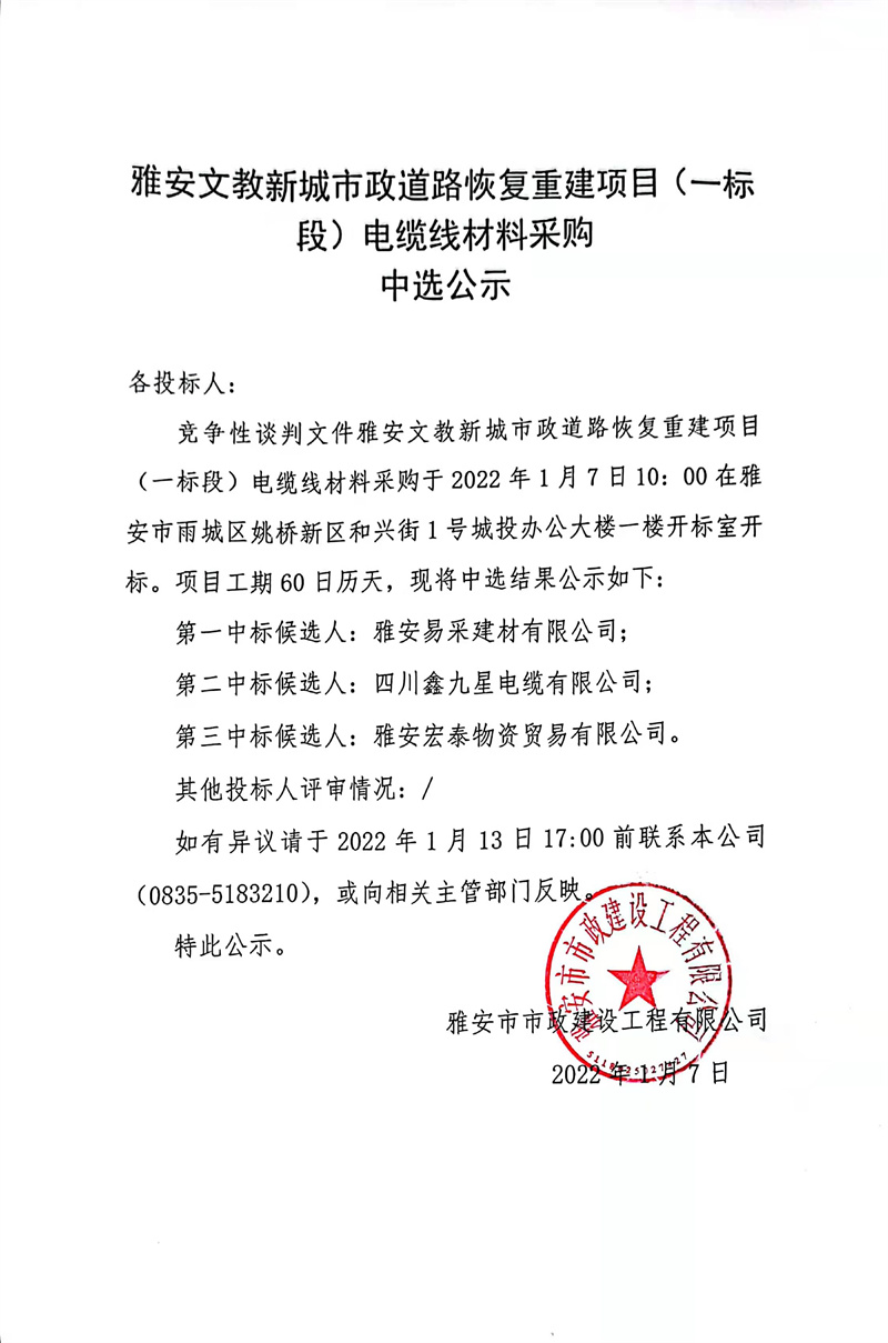 雅安文教新城市政道路恢復(fù)重建項目(一標段)電纜線材料采購中選公示