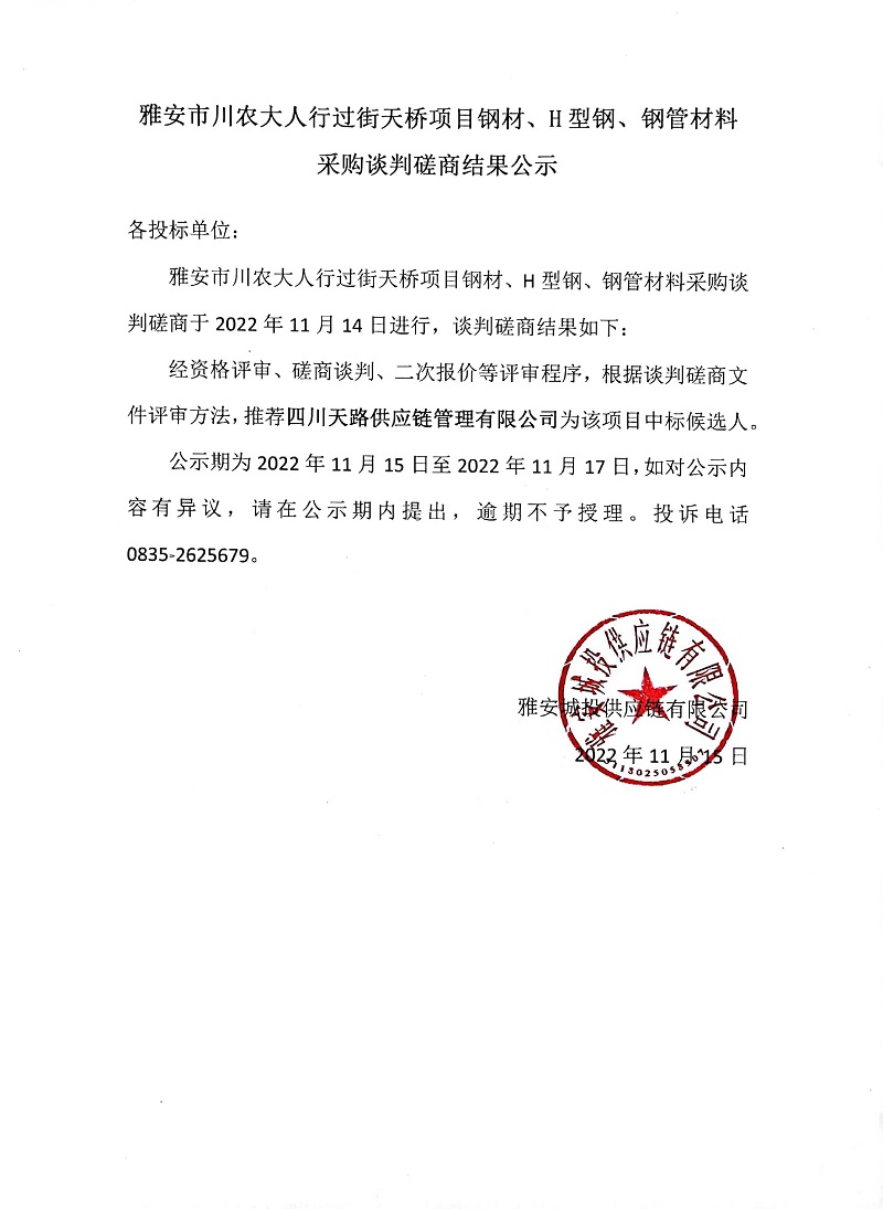 雅安市川大人行過街天橋項(xiàng)目鋼材、H型鋼、鋼管材料采購談判磋商結(jié)果公示