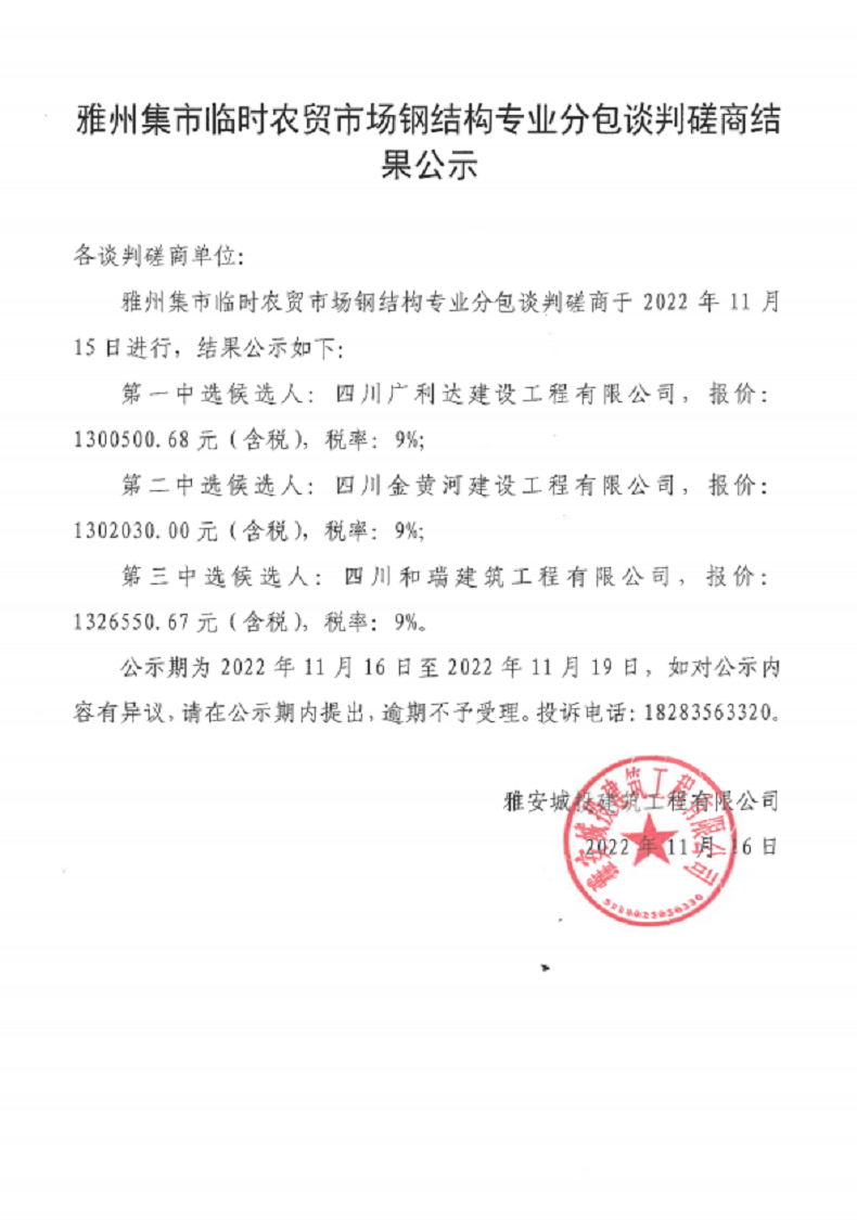 雅州集市臨時農(nóng)貿(mào)市場鋼結(jié)構(gòu)專業(yè)分包談判磋商結(jié)果公示