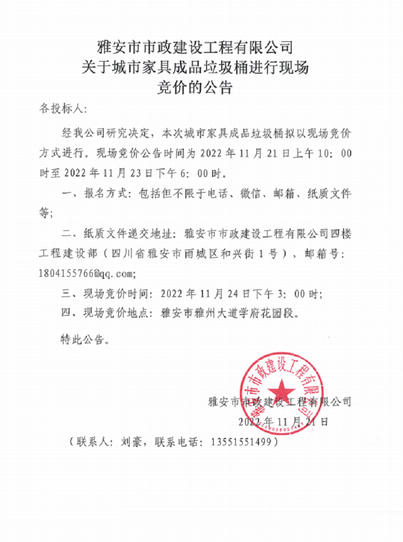 雅安市市政建設工程有限公司關于城市家具成品垃圾桶進行現(xiàn)場競價的公告