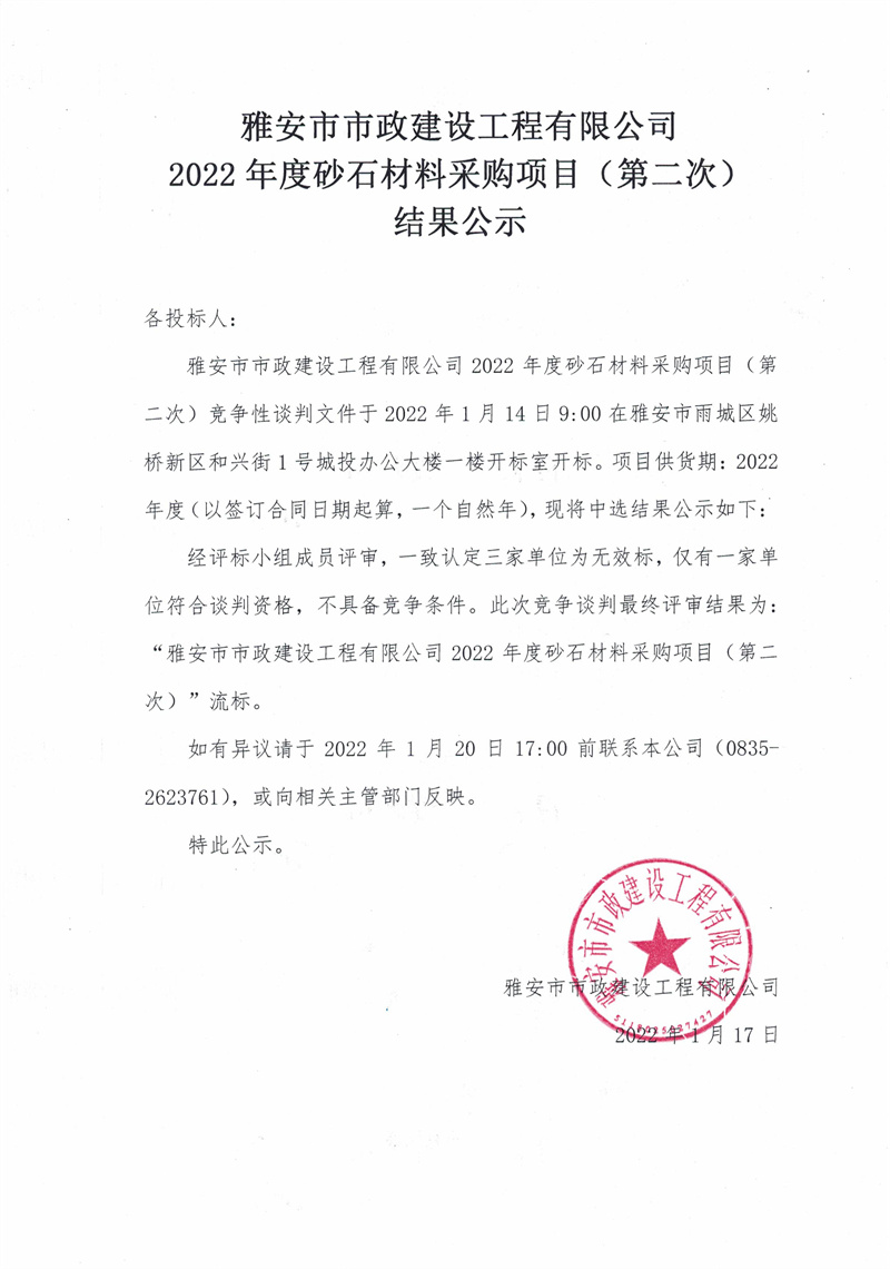 雅安市市政建設(shè)工程有限公司2022年度砂石材料采購(gòu)項(xiàng)目(第二次)結(jié)果公示
