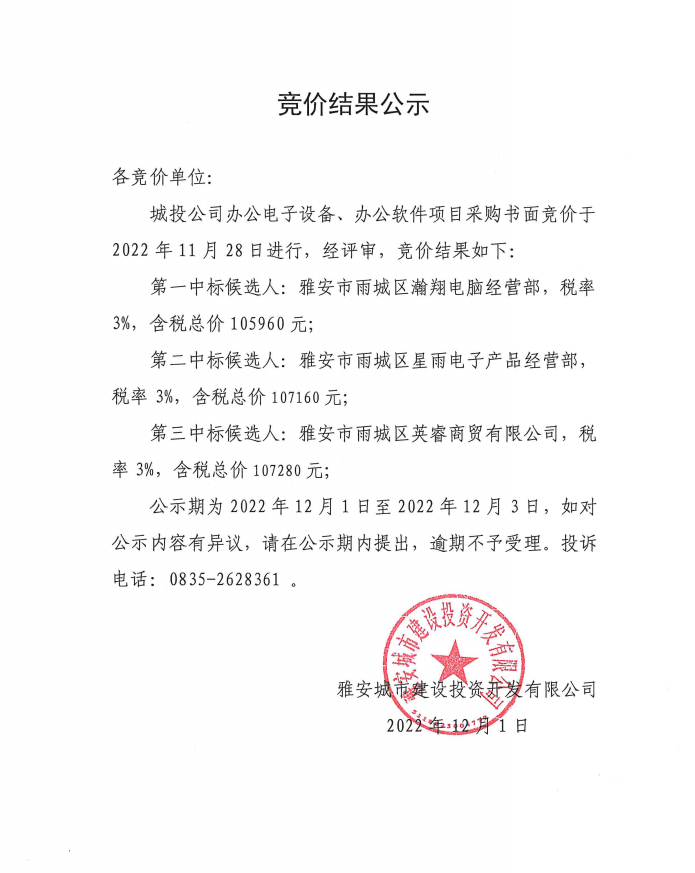 雅安城市建設(shè)投資開發(fā)有限公司辦公電子設(shè)備、辦公軟件項(xiàng)目采購競價(jià)結(jié)果公示