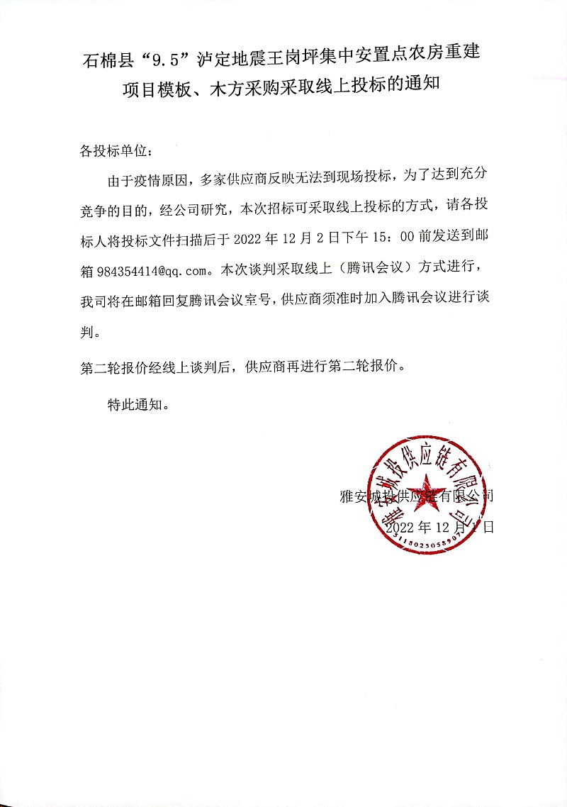 石棉縣“9.5”瀘定地震王崗坪集中安置點農(nóng)房重建項目模板、木方采購線上投標的通知