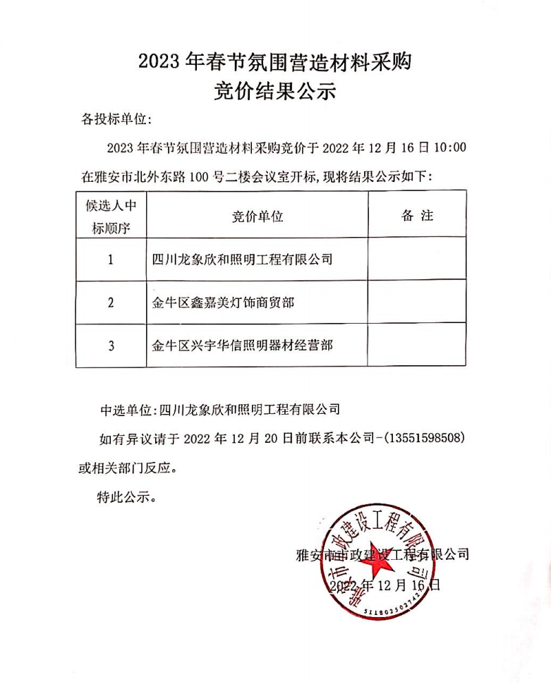 2023年春節(jié)氛圍營造材料采購競價(jià)結(jié)果公示