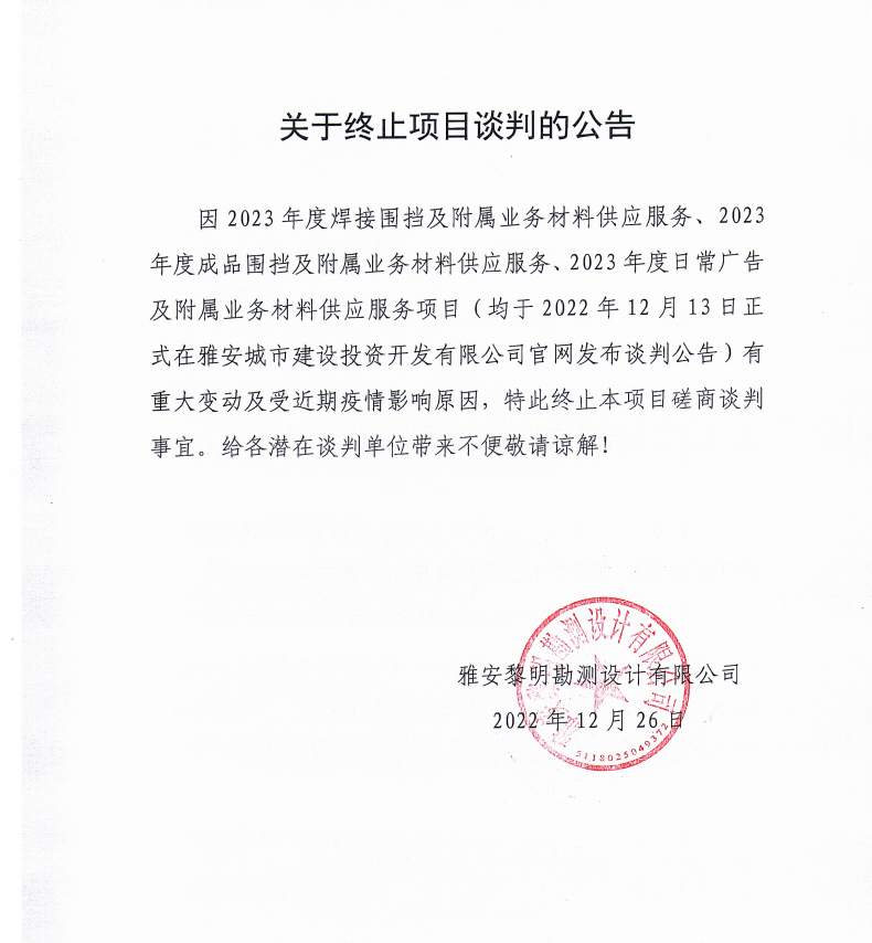 關(guān)于終止2023年度焊接圍擋及附屬業(yè)務(wù)材料、2023年度成品圍擋及附屬業(yè)務(wù)材料、2023年度日常廣告及附屬業(yè)務(wù)材料的供應(yīng)服務(wù)項(xiàng)目談判的公告