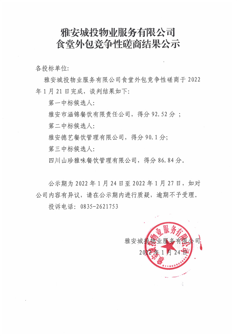 雅安城投物業(yè)服務(wù)有限公司食堂外包競(jìng)爭性磋商結(jié)果公告