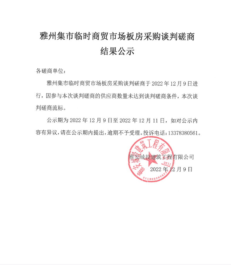 雅州集市臨時(shí)商貿(mào)市場(chǎng)板房采購(gòu)談判磋商結(jié)果公示
