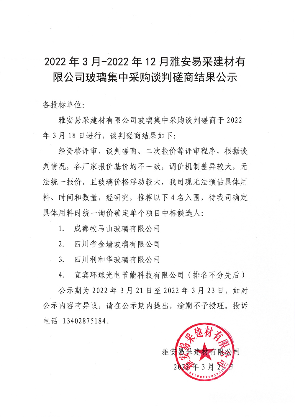 2022年3月-2022年12月雅安易采建材有限公司玻璃采購談判磋商結果公示