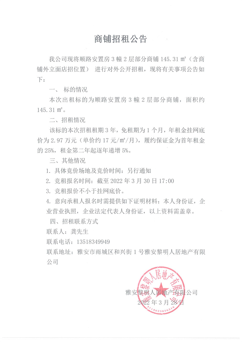 順路安置房3幢2層部分商鋪招租公告