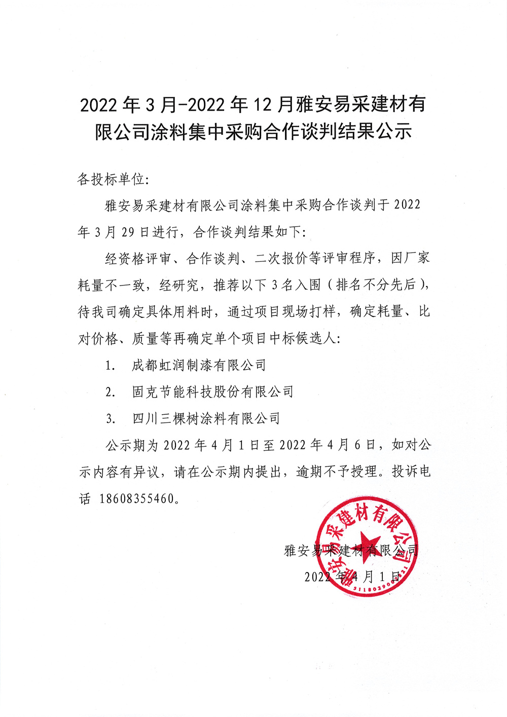 2022年3月-2022年12月雅安易采建材有限公司涂料集中采購合作談判結(jié)果公示