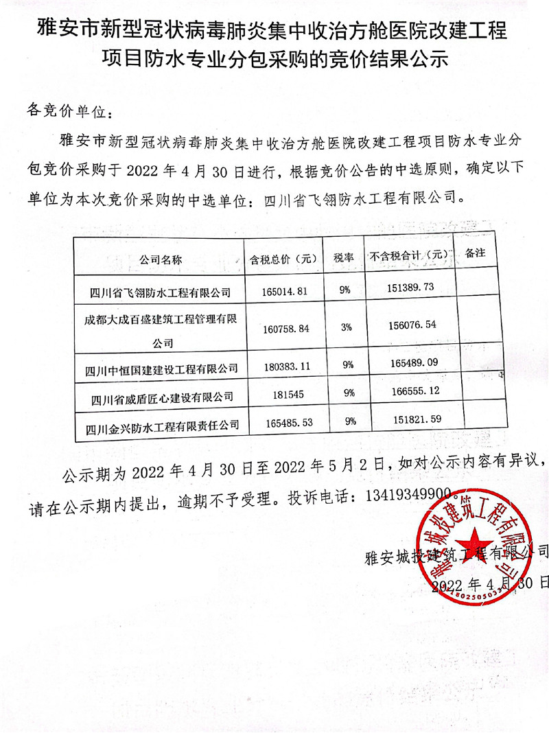 雅安市新型冠狀病毒肺炎集中收治方艙醫(yī)院改建工程項(xiàng)目防水專業(yè)分包采購的競價結(jié)果公示
