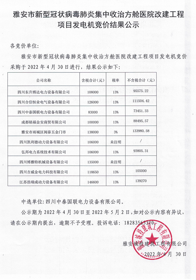 雅安市新型冠狀病毒肺炎集中收治方艙醫(yī)院改建工程項(xiàng)目發(fā)電機(jī)競價結(jié)果公示