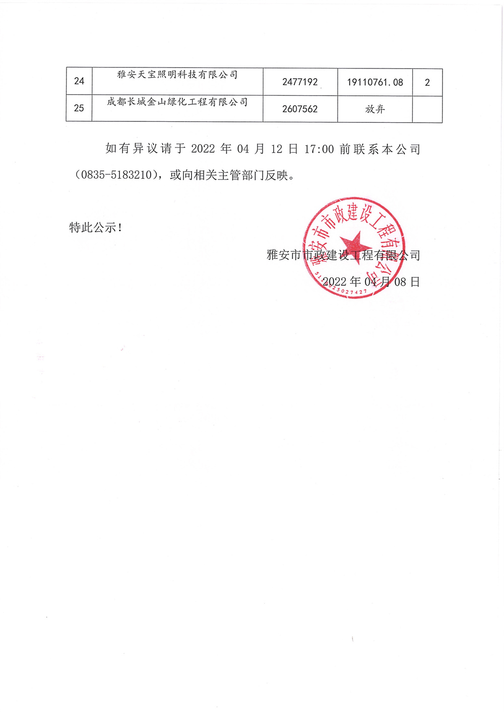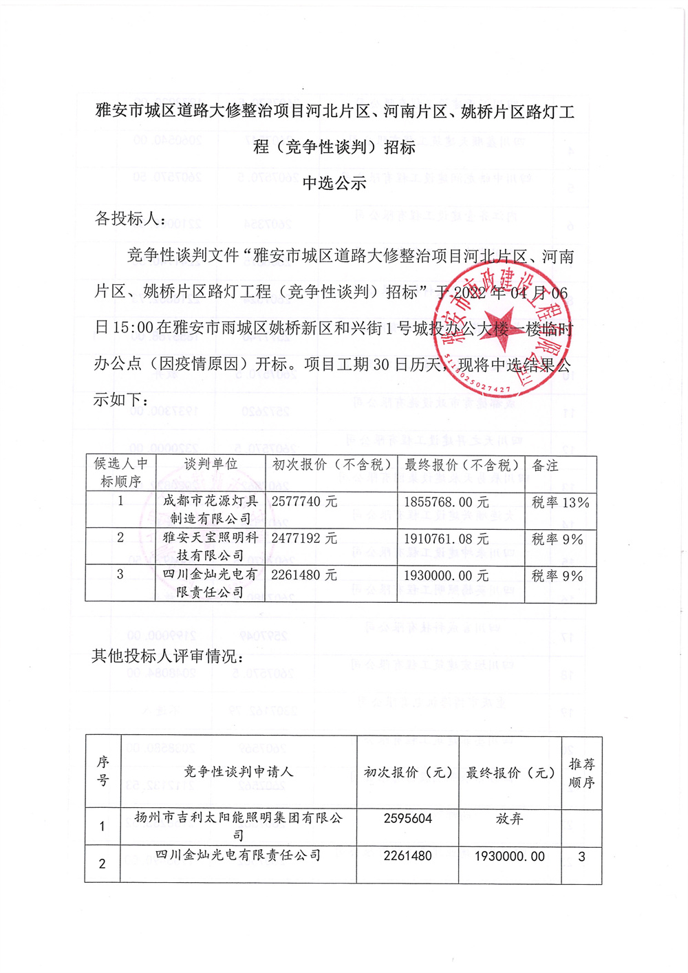 雅安市城區(qū)道路大修整治項(xiàng)目 河北片區(qū)、河南片區(qū)、姚橋片區(qū)路燈工程競爭性談判招標(biāo)中選公示