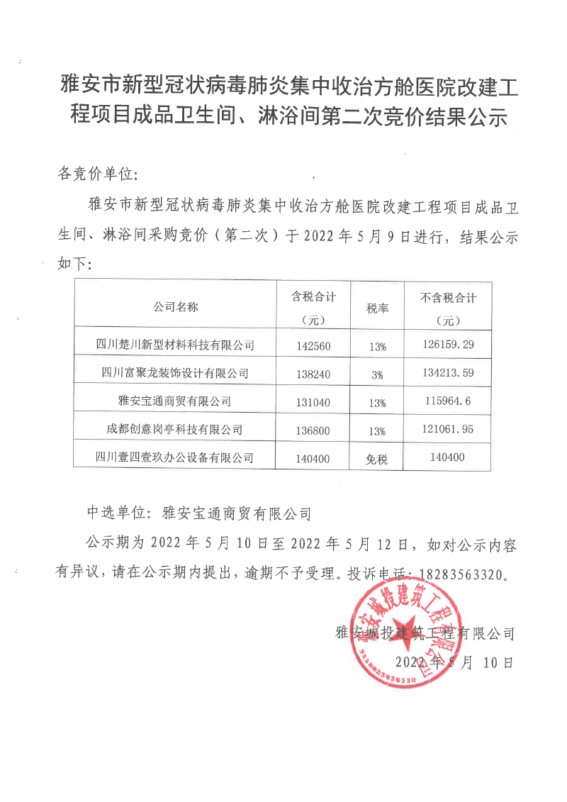 雅安市新型冠狀病毒肺炎集中收治方艙醫(yī)院改建工程項(xiàng)目成品衛(wèi)生間、淋浴間競價(jià)(第二次)結(jié)果公示