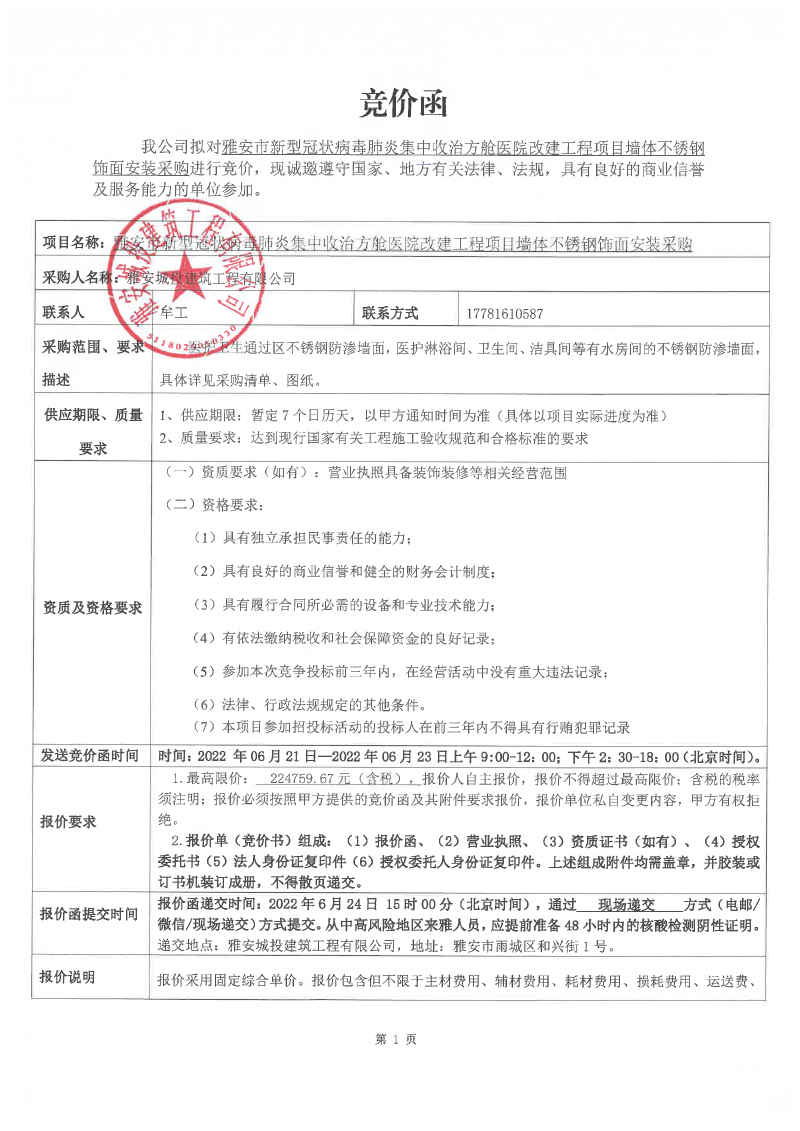 雅安市新型冠狀病毒肺炎集中收治方艙醫(yī)院改建工程項目墻體不銹鋼飾面安裝采購競價公告