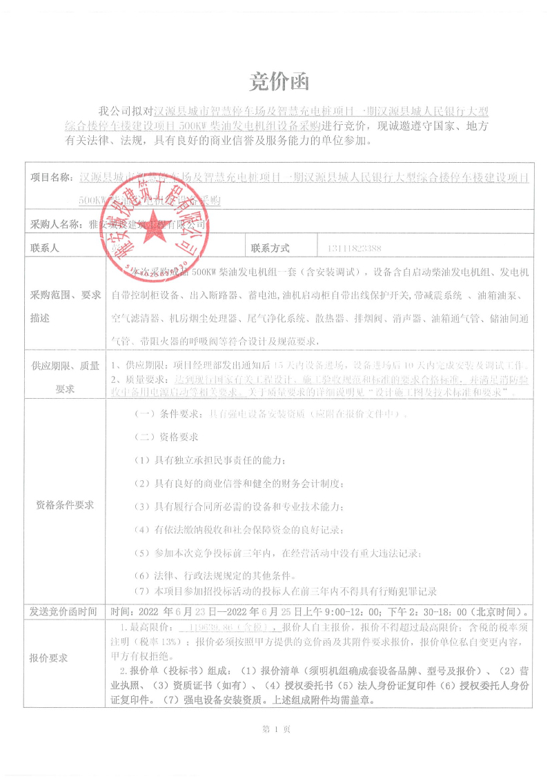 漢源縣城市智慧停車場及智慧充電樁項(xiàng)目一期漢源縣城人民銀行大型綜合樓停車樓建設(shè)項(xiàng)目500kw柴油發(fā)電機(jī)組設(shè)備采購競價公告
