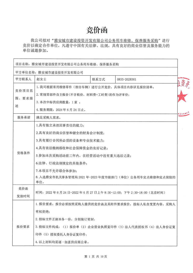 雅安城市建設(shè)投資開(kāi)發(fā)有限公司 公務(wù)用車維修、保養(yǎng)服務(wù)采購(gòu)項(xiàng)目競(jìng)價(jià)公告