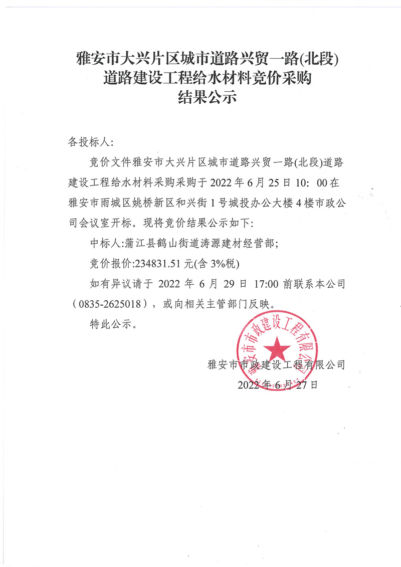 雅安市大興片區(qū)城市道路興貿(mào)一路(北段) 道路建設(shè)工程給水材料采購(gòu)結(jié)果公告