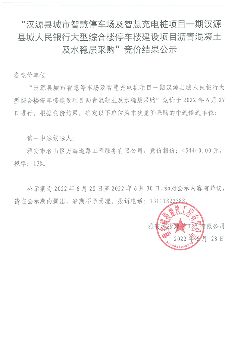 漢源縣城市智慧停車場(chǎng)及智慧充電樁項(xiàng)目一期漢源縣城人民銀行大型綜合樓停車樓建設(shè)項(xiàng)目瀝青混凝土、水穩(wěn)層采購競(jìng)價(jià)結(jié)果公告