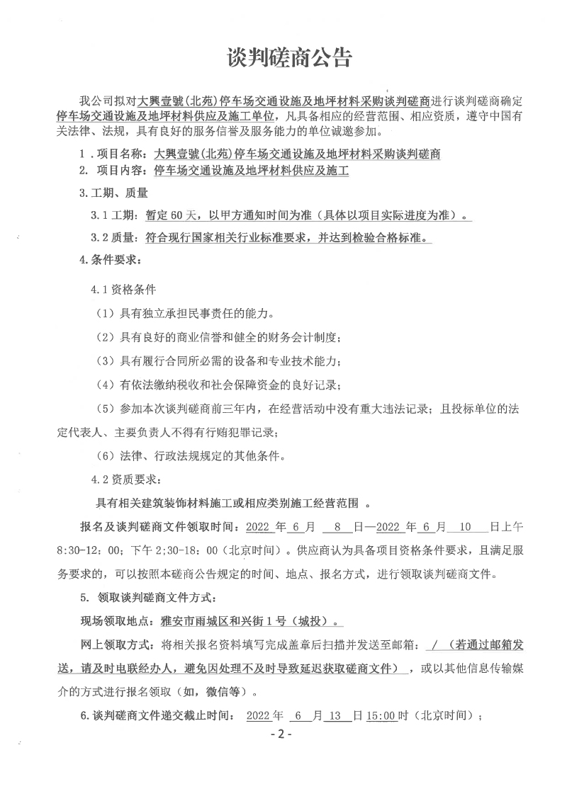 大興壹號(北苑)停車場交通設(shè)施及地坪材料采購談判磋商公告