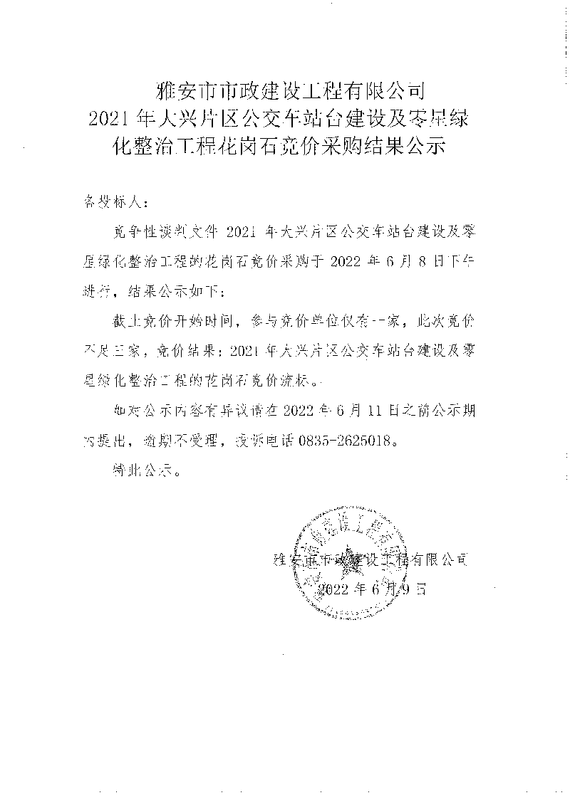 2021年大興片區(qū)公交站臺(tái)建設(shè)及零星綠地整治工程花崗石競價(jià)采購結(jié)果公示
