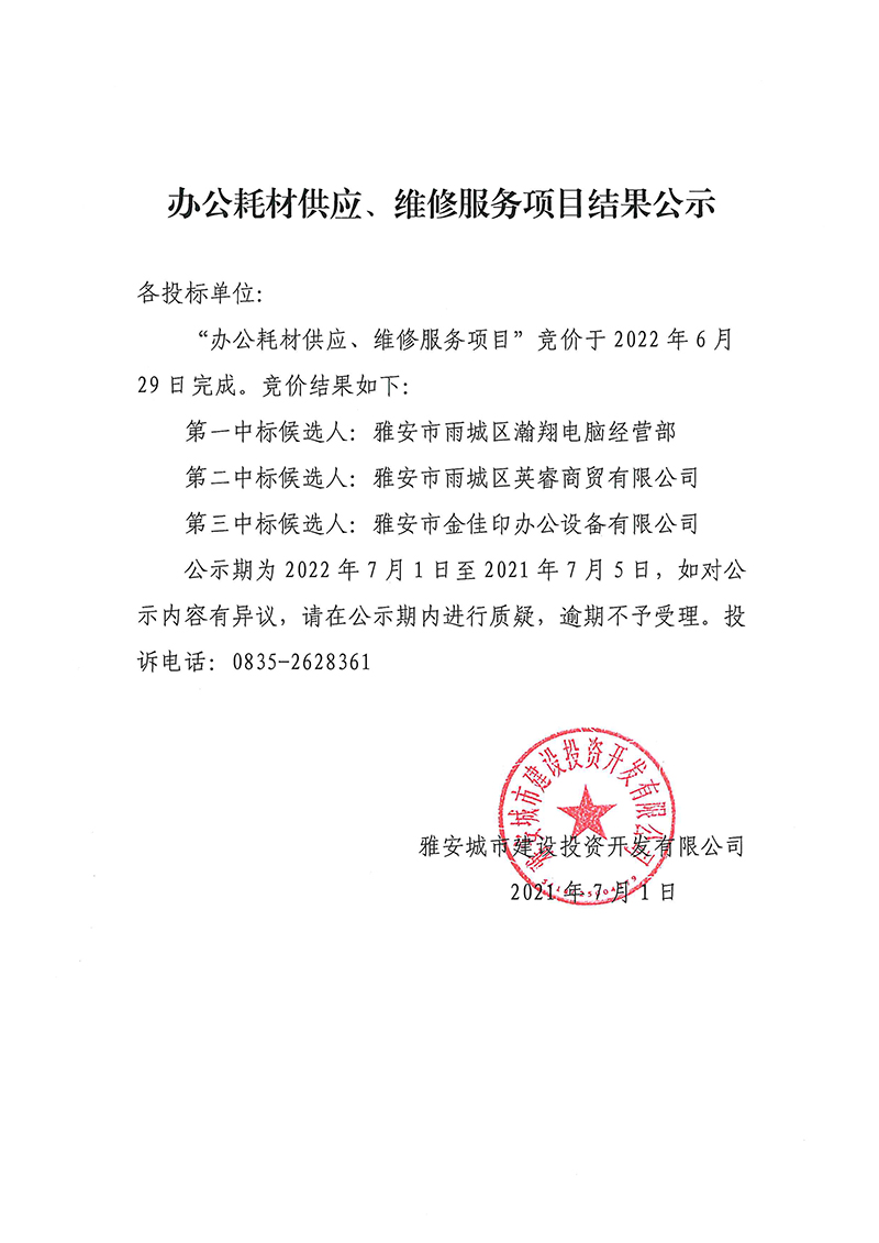 雅安城市建設(shè)投資開發(fā)有限公司 辦公耗材供應(yīng)、維修服務(wù)項目采購競價結(jié)果公示