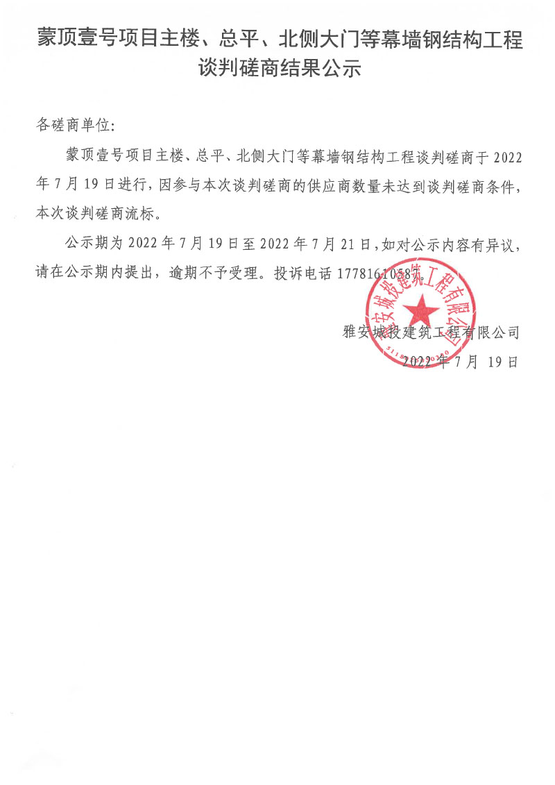 蒙頂壹號項目主樓、總坪、北側大門等幕墻鋼結構工程談判磋商結果公示